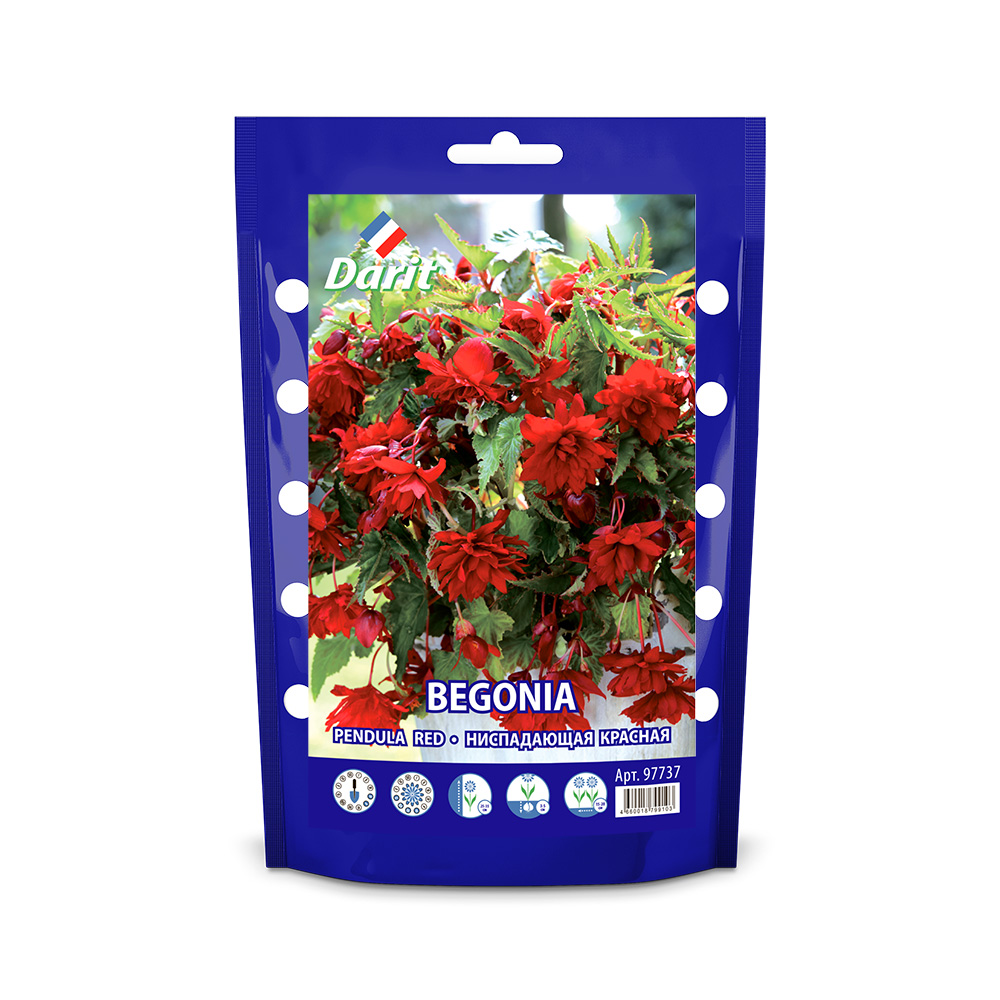 Бренд Darit Культура бегония Сезонность посадки весна Вид цветка ампельный Вид упаковки дой-пак Цвет красный Период цветения лето Место посадки солнечное, притененное -