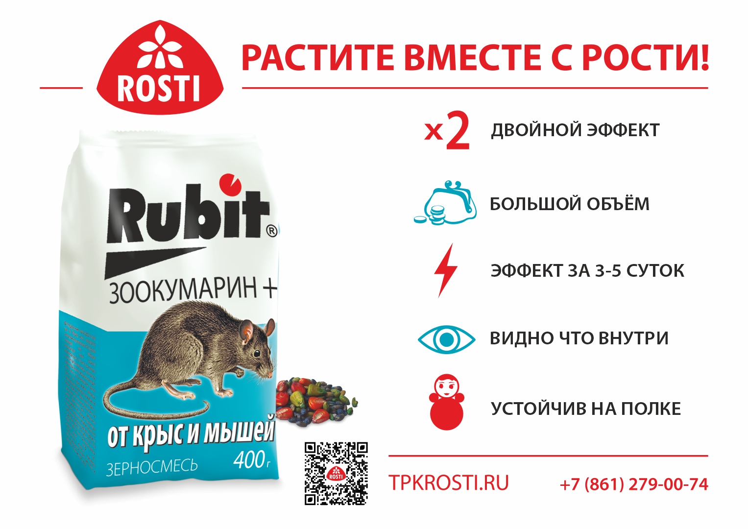Бренд Rubit Штук в упаковке 80 Действующее вещество варфарин, бромадиолон Назначение препарата (тип вредителя) от комнатных вредителей, от крыс, от мышей, от мышей-полевок, от садовых муравьев Документы