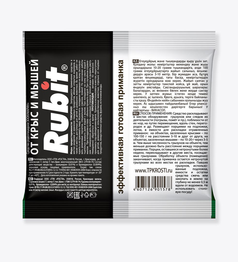 Бренд Rubit Штук в упаковке 30 Действующее вещество варфарин, бромадиолон Назначение препарата (тип вредителя) от комнатных вредителей, от крыс, от мышей, от мышей-полевок, от садовых вредителей Документы