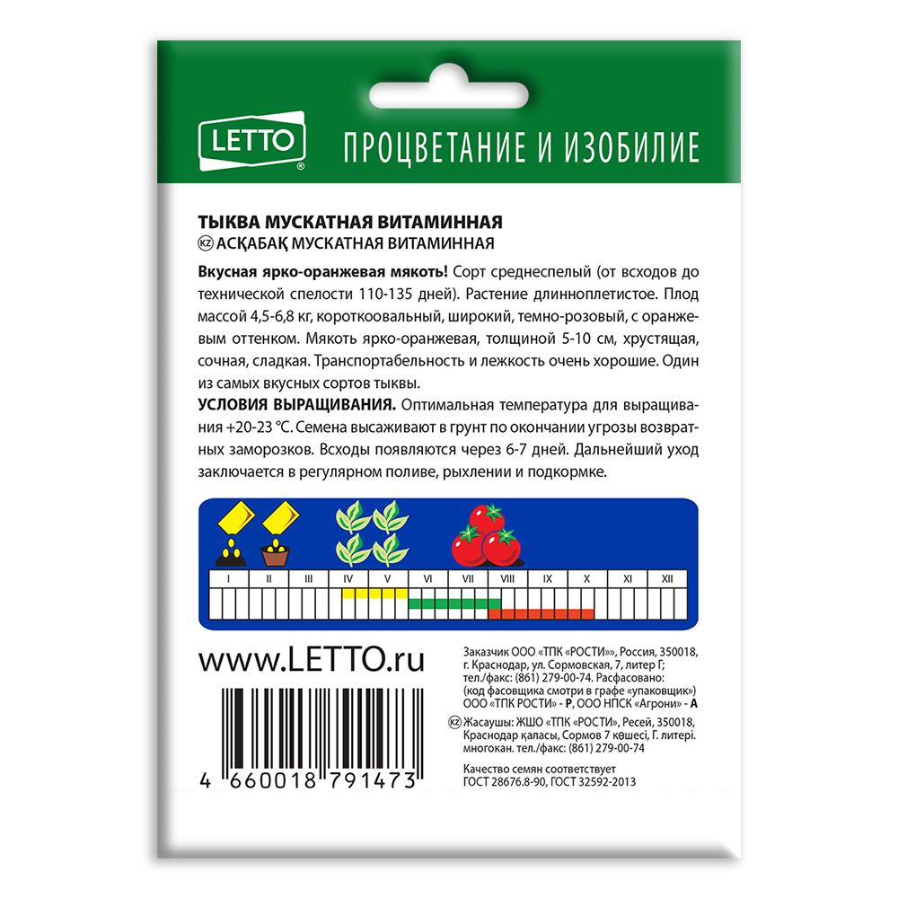 Бренд АГРОУСПЕХ НОВА Культура тыква Тип созревания среднеспелый Срок созревания 110-135 дней Рослость растения низкорослый Высота растения 50-70 см Окрас плода (цветка) оранжевый Вес плода 4,5-6,8 кг Время посадки апрель-май Схема посадки 100x150 см Время уборки урожая август-сентябрь Сортность сорт Вид упаковки цветной пакет Серия/коллекция Агроуспех НОВА Документы