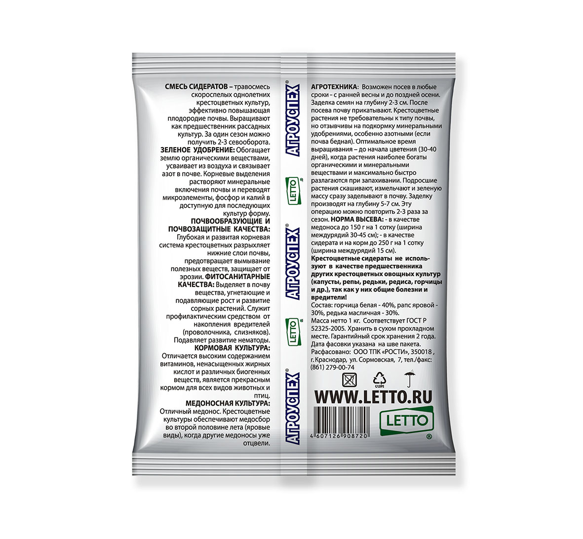 Описание"Травосмесь скороспелых однолетних крестоцветных культур, эффективно повышающая плодородие почвы. Выращивают как предшественник рассадных культур. За один сезон можно получить 2-3 севооборота.