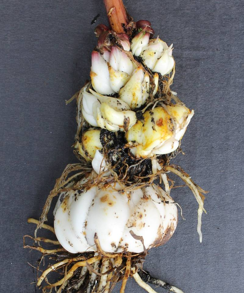 Клубень представляет собой толстый диск с углублением на вершине, из которого растут побеги. Клубень помещают в растительный сосуд углублением вверх и засыпают почвой толщиной всего в палец.